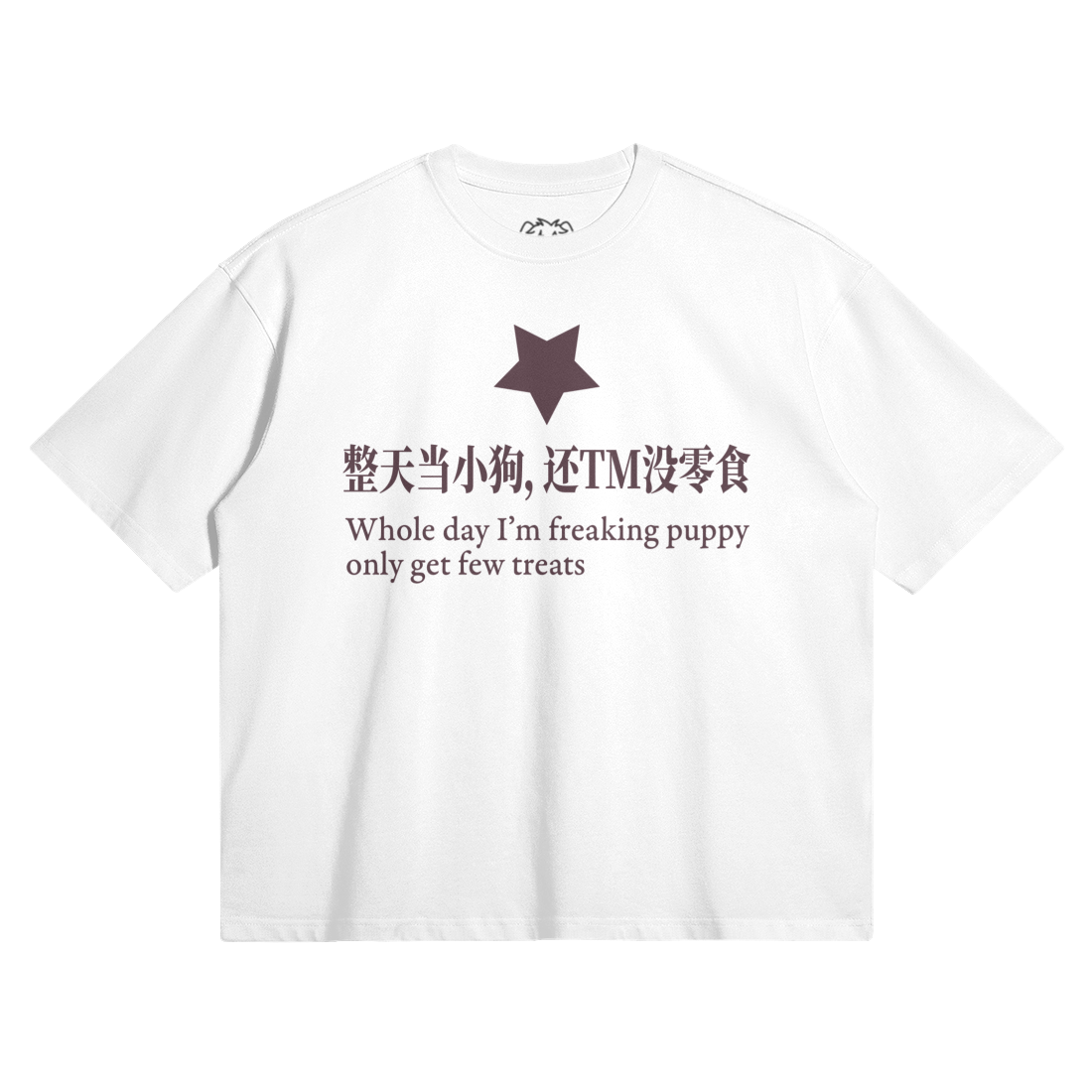 Spoof of the "Whole day I'm fucking busy only get few money" Chinese bootleg design / meme. But for puppies.