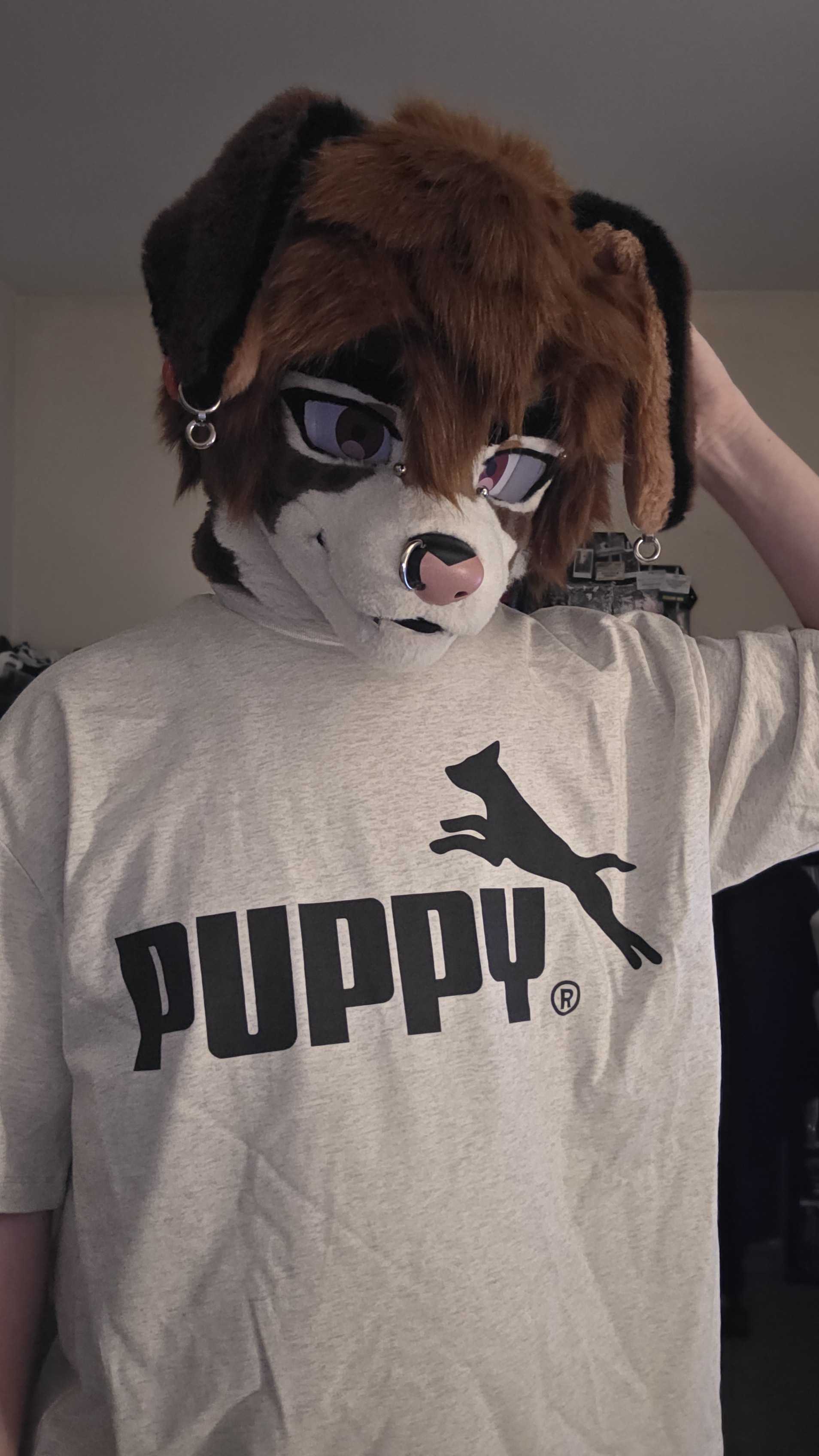 Spoof of a popular sports brand but doggy. Big print on heather gray and black boxy fit tees.